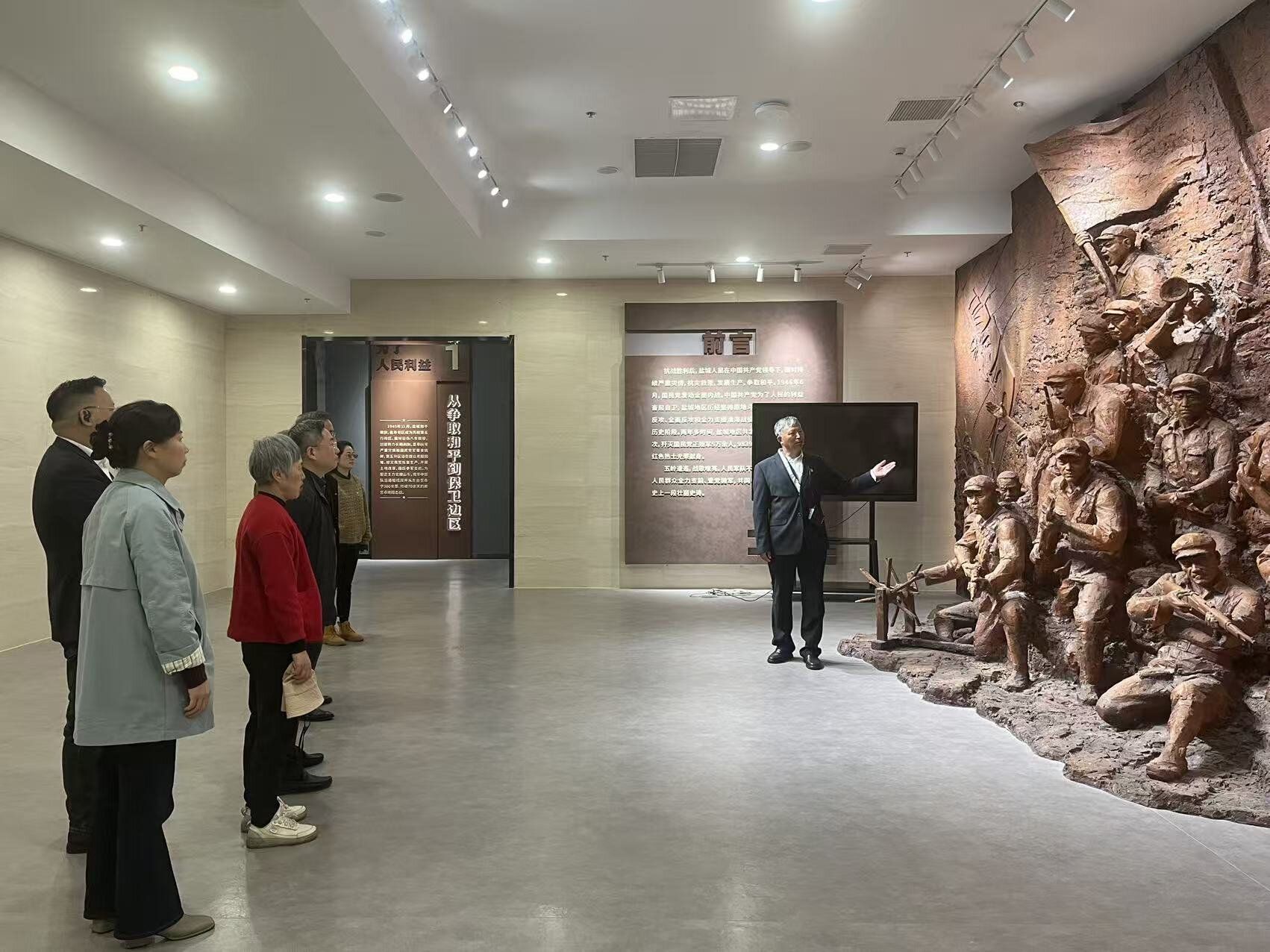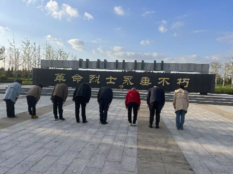 第三代守墓人带领大家参观了烈士合葬墓、展馆文物,详细讲解了盐南阻击战历史及三代守墓人故事。全体党员干部佩戴党徽肃立于五条岭烈士陵园纪念碑和盐南战斗革命烈士广场前,向革命先烈默哀。